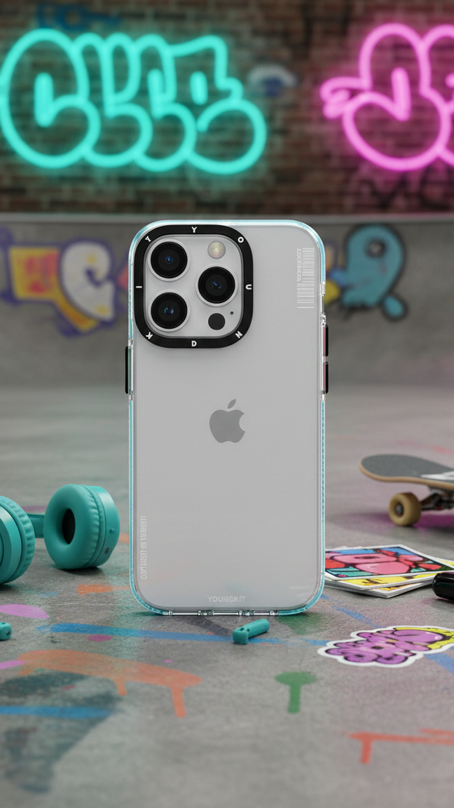 قاب Youngkit با بدنه ی شفاف مات و دور آبی جذاب، زیبایی اصلی آیفون شما را حفظ میکند و در عین حال جلوهای مدرن و خیابانی (Street Style) به آن میدهد. فریم دور لنز با طراحی گرافیکی خاص، گوشی شما را کاملاً متمایز از بقیه نشان میدهد.